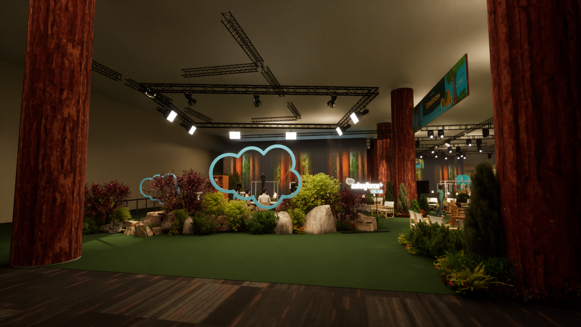 Creating a collective area where attendees can gather more information about growing their business, lounge, make true connections, and even bring home some of the magic of Salesforce. By incorporating Dreamforce's collective aesthetic of National Parks and making it come alive, attendees can feel as if they have been transported to a colorful forest clearing.